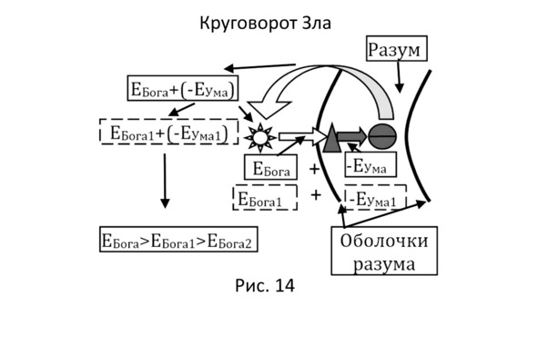 Если круговорот Добра возрастает в величине божественных энергий, а круговорот Безразличия их оставляет прежними, то круговорот Зла их явно уменьшает. Это приводит к деградации разума человека. Мы пока ведём речь только о круговоротах божественных энергий, но существуют ещё зеркальные круговороты негативных энергий. Если мы возрастаем в своём разуме в величине божественных энергий, то понижаемся в величине негативных энергий. Если ничего не изменяется в энергиях как при круговороте Безразличия, то ничего не меняется и при обращении негативных энергий. Круговорот Зла понижает нам величину божественных энергий и явно он должен возрастать в величине своих негативных энергий. Поэтому, говоря о понижении уровня божественных энергий в нашем разуме, мы подразумеваем в нём возрастание негативных энергий Зла.