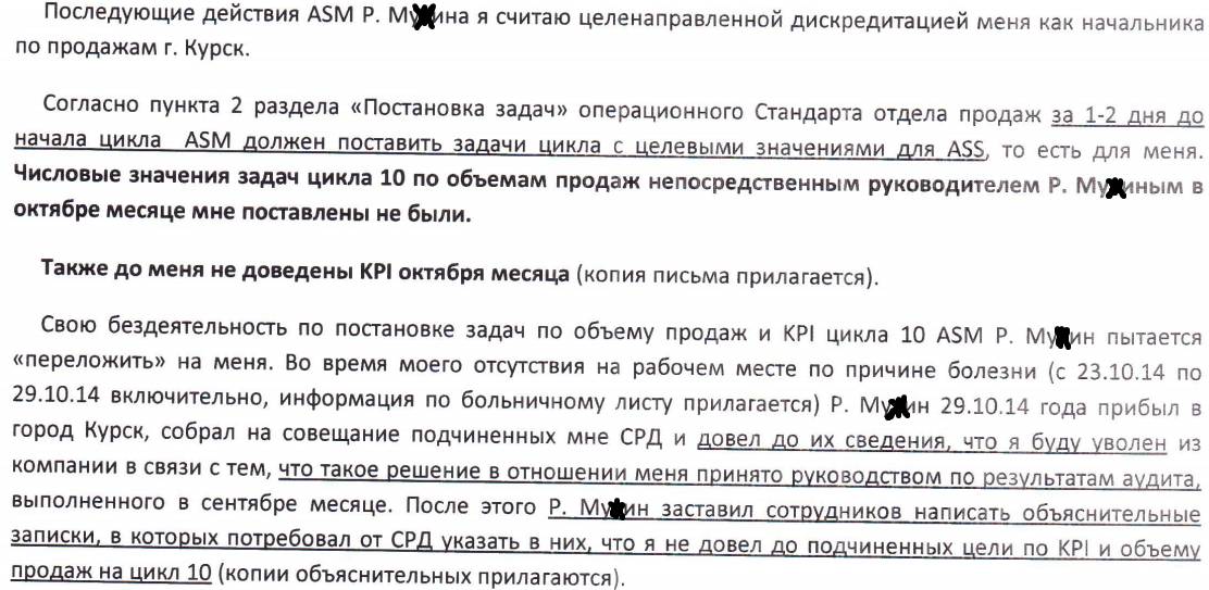 По приезду в Курск, я узнал, что Вячеслав неожиданно заболел и ушёл на больничный. Со среды по пятницу, я проводил все собрания со специалистами, заодно выявлял, в прочем как обычно при визите в город, насколько они знают и понимают свои задачи на месяц, на год, повторили стандарты продаж. Толи они перенервничали, но неожиданным оказалось, что никто не смог назвать мне точно цели текущего периода. Так братцы, в чём дело? И мы ещё боремся за звание почётного дома культуры и имеем наглость рассуждать о несправедливости оценки Московских руководителей! Коммуникация от меня идёт единая на все города одновременно! Почему в Курске сбой? Коллеги Курска, отличались хорошей способностью найти крайних, и пока супервайзера не было, сослались на него. Что мол, скорее всего он не успел довести до них информацию, так как ежемесячно цели по SO приходят с опозданием. По дистрибутивным задачам, которые входят в состав годовых целей и которые не менялись – ответа не нашлось, по сему, для профилактики различных умственных заболеваний, дружно написали объяснения. Отдельно проговорил с ними результаты всех последних аудитов, выслушал их позицию и сообщил, что возможны изменения с их непосредственным руководителем, по результатам работы. Это было необходимо, что бы подготовить их к изменениям. Что бы они поняли правильно связь изменений с результатами работы. Что бы подготовить команду к возможной негативной реакции со стороны супервайзера и возможного влияния на них. Замотивировал на работу информацией, что всё самое лучшее у нас впереди и по ним самим вопросов нет, при желании могут выдвигать свои кандидатуры в рамках Политик Компании «о приоритетном развитии сотрудников изнутри». С Вячеславом, я договорился по телефону просто встретиться поговорить. Я не стал мутить и предложил поговорить начистоту, повторил общую информацию из обратной связи директора по продажам, по Курску и, особенно, по Орлу. Рассказал, что по результатам аудита, все уровни сотрудников – команда специалистов Курска и Орла, все руководители – я и мой руководитель, лишены бонусов за месяц. Довёл информацию о принятом решении развивать данную территорию с другим супервайзером. Результаты аудита трейд маркетинга Олега К, я не упоминал, уж совсем не убедительные они были. Он воспринял, спокойно, сказал, что не согласен, что причин для увольнения не видит. После недолгих объяснений о отсутствии вариантов продолжать совместно работать , он обозначил, сколько желает получить от компании для беспроблемного увольнения. В течении недели, я согласовал со своим руководителем, часть от его пожеланий, провел ещё 2 встречи с беседами и мы подписали соглашение.