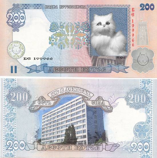 Думая, как назвать и вводить в наш город валюту, мы решили именовать деньги кэтами (от услышанного в Америке «cat», что означает «кот»), напечатать их определённое количество и выдать мэрии, которая бы распространила кэты по нужным заведениям, откуда бы их в качестве зарплаты получали горожане. Деньги должны были раздавать предприятиям по мере необходимости, все же незадействованные купюры хранились бы в городской казне. А чтобы ни мэрия, ни кто другой не прибрал «ненужные» кэты к лапам, городской совет решил, чтобы все горожане могли свободно следить как за работой правительства, так и за получаемыми и отправляемыми отчётами. Идея появления валюты была принята горожанами, в особенности ликовал Бобик-затулянт, запарившийся крутить свой бизнес на одном лишь обмене, вскоре планы были приведены в действие, и вот уж в городе заработала удобная финансовая система. Даже выдавать дополнительные деньги не потребовалось: кэты стали просто переходить от предприятий горожанам и от горожан другим предприятиям, как и планировалось.