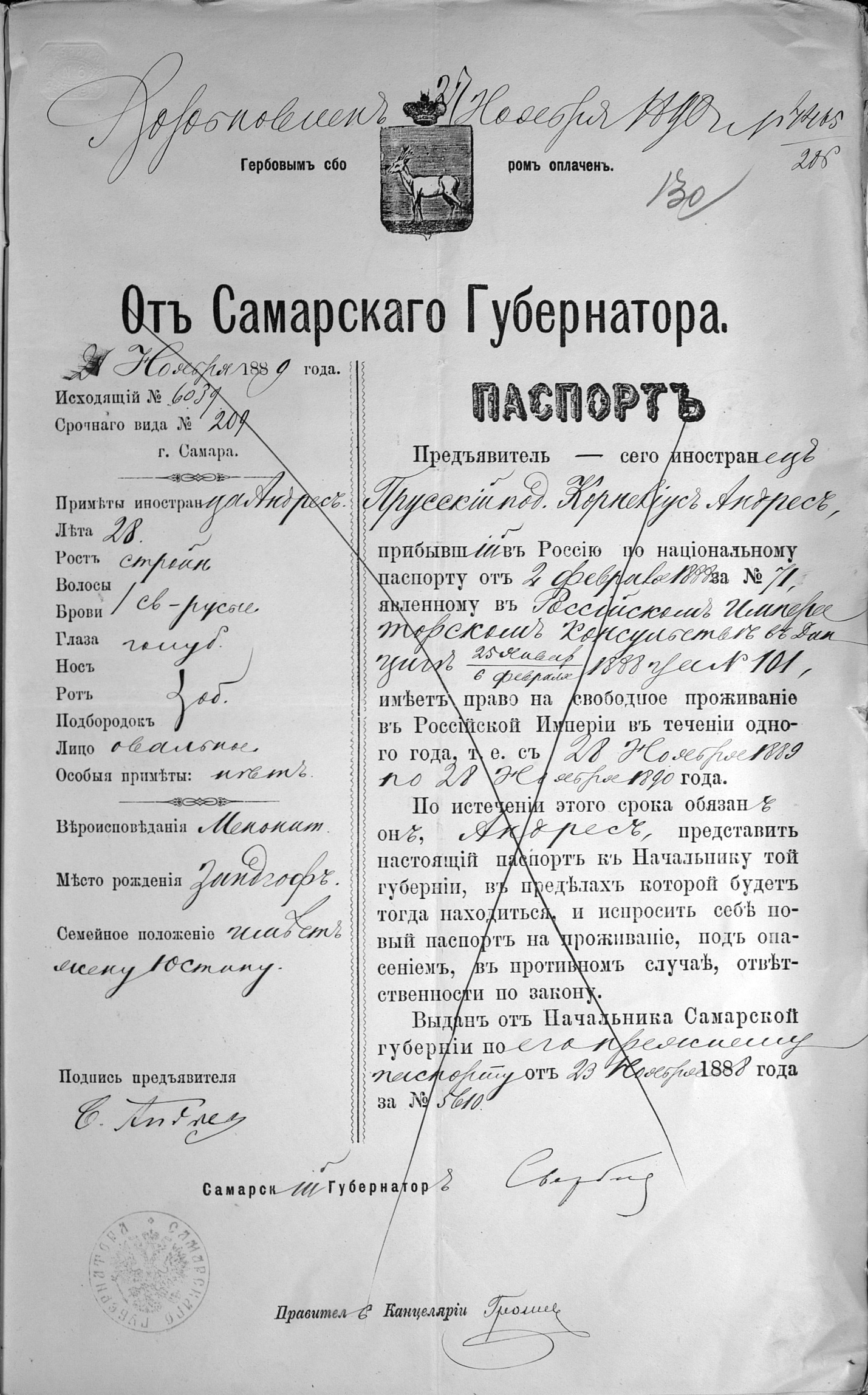 Представляю имеющуюся у меня подборку годичных паспортов иностранцев колонии Ам Тракт и других меннонитов Самарской губернии. Семейное положение в разные годы менялось, потому пишу максимум той информации, что есть у меня из нескольких экземпляров, т.е. полученных в разные годы. Понятно, что это далеко не все годичные паспорта иностранцев, проживавших в колонии Ам Тракт, поскольку в них указывалось только место рождения, потому выбрать из них нужные затруднительно. Можно было это сделать, основываясь на графу Вероисповедание, но и там зачастую информация не верная, вместо Меннонитского, можно встретить Лютеранского, Евангелического, Кальвинистского и т.д. Зачастую в своих прошениях меннониты просили исправить данную графу, но ошибки и опечатки не всегда поддавались исправлениям в российской бюрократической системе.