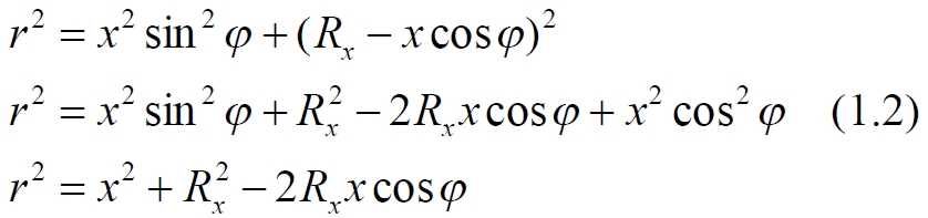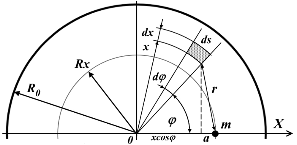 При вычислениях интеграла величина x для некоторого положения тела Rx изменяется в интервале от 0 до R0 – на полном интервале радиуса диска. Этот интервал x следует формально разделить на два участка. На первом участке всегда x ≤ Rx, на втором – всегда x > Rx. Это приводит к тому, что в первом случае величина (1.4) и соответствующий ей интеграл в (1.3) оказывается положительной величиной всегда, а во втором, при некоторых углах φ, величина (1.4) и соответствующий ей интеграл в (1.3) становятся отрицательными. На знак интеграла знаменатель влияния не оказывает, поскольку сумма квадратов величин всегда больше их удвоенного произведения. Действительно, максимальное значение отрицательного слагаемого, способного сделать эту сумму отрицательной, определяется значением косинуса. Максимум отрицательной величины очевиден – это единичное значение косинуса: