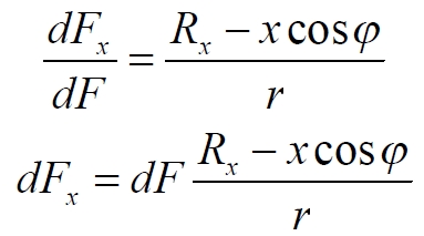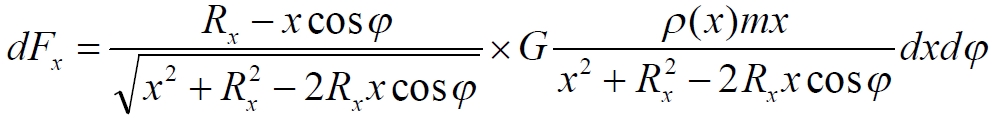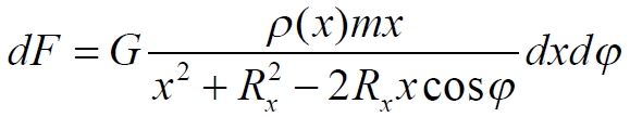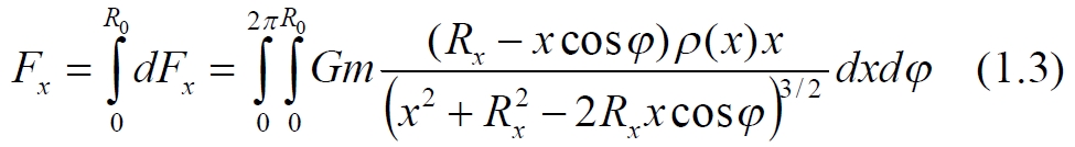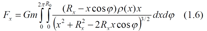 То есть, мы получили величину, которая никогда не принимает отрицательных значений, следовательно, и (1.5) также всегда положительна. Это означает, что при значениях параметра x, для некоторых обручей диска, являющихся для m внешними, сила притяжения при определённых углах φ имеет отрицательные значения, то есть, уменьшает силу притяжения тела в сторону центра диска. Запишем окончательное уравнение для результирующей силы, действующей на пробное тело m
