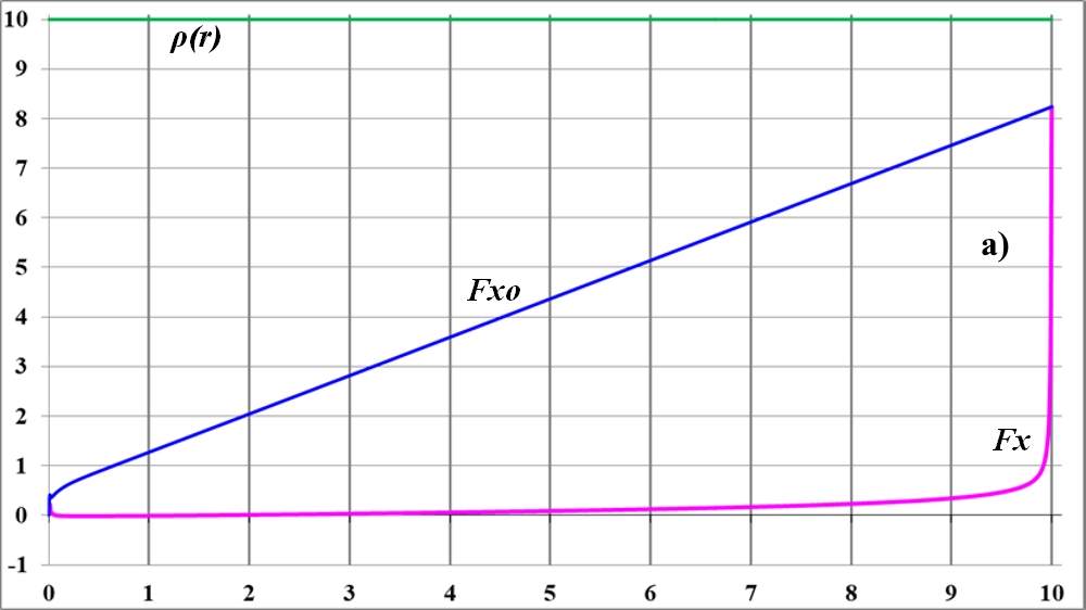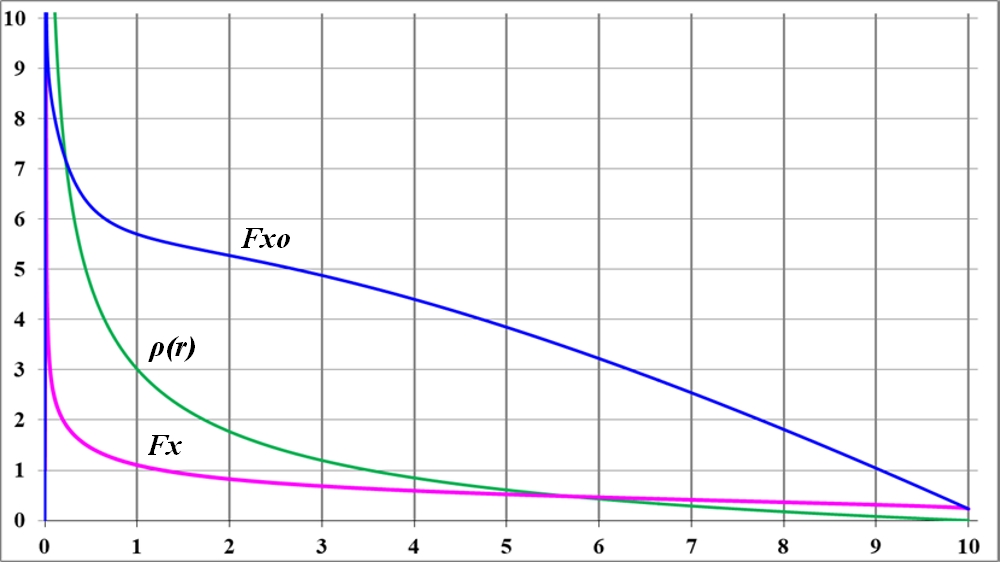 График Fxo практически прямолинейный, то есть, сила притяжения к центру однородного диска тела, находящегося на его краю, прямо пропорциональна радиусу диска.