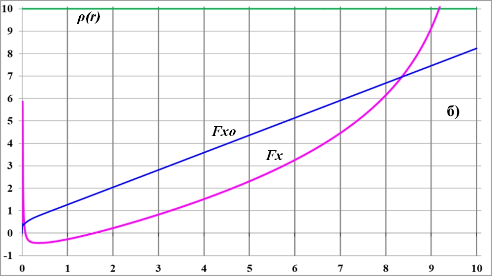 На верхнем рисунке, рис.2.1a в равных масштабах приведены графики: Fx – график полной силы, с учётом внешних слоёв диска, Fxo – без учёта этих слоёв. Напомним, что для объекта m внешние слои диска – это условные обручи с радиусом, превышающим удалённость объекта от центра диска. Графики на рис.2.1a полностью вписаны в диаграмму. На нижнем рисунке рис.2.1б график Fx приведён в увеличенном масштабе. Как видим, на начальном участке график Fx уходит в минус. Это означает, что тело притягивается не к центру диска, а наружу, к его периферии, внутри обруча тело испытывает силу притяжения к его ближней части. Скачок графика Fx в самом начале координат может быть связан, например, с достаточно грубой дискретностью на начальном этапе. Действительно, окружность Rx радиусом в одну дискрету программой рассматривается не как окружность, а как прямоугольник со сторонами dx на πdx. Другой вариант объяснения пика – на начальном этапе, на малых дистанциях влияние внутренних сил диска выше, чем внешних. Проверить, что из этого верно, можно лишь увеличив точность вычислений в области центра диска.