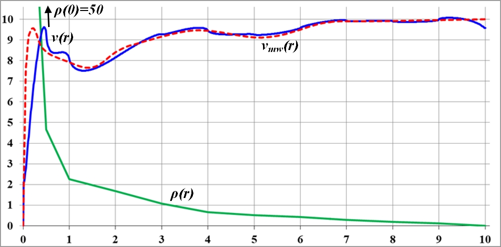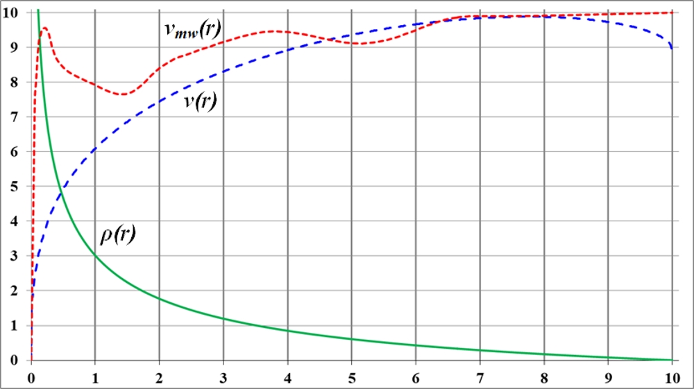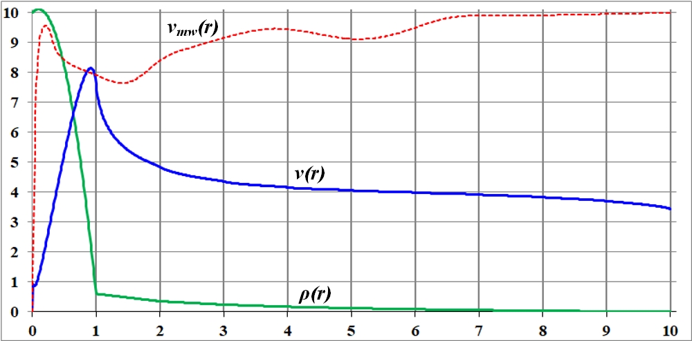 Рис.3.6. Подобранная функция плотности ρ(r) и соответствующая ей кривая вращения v(r) приемлемо, максимально совпадающая с эталонной, наблюдаемой кривой вращения vmw(r) галактики Млечный Путь