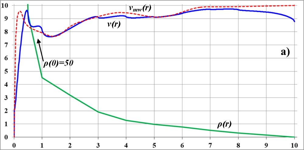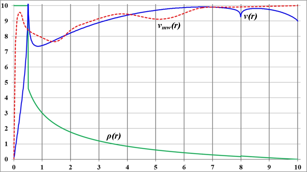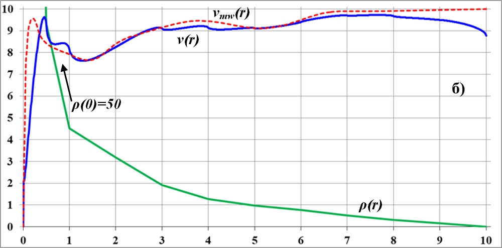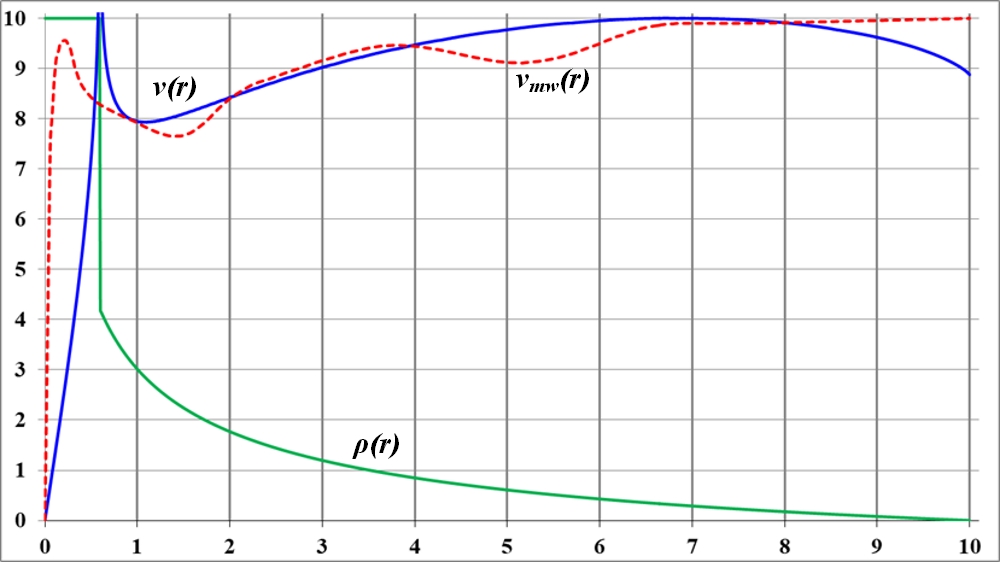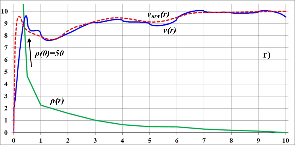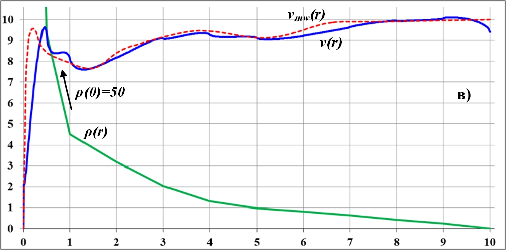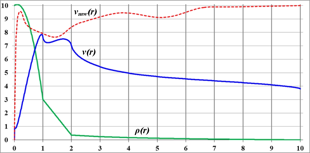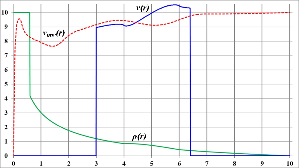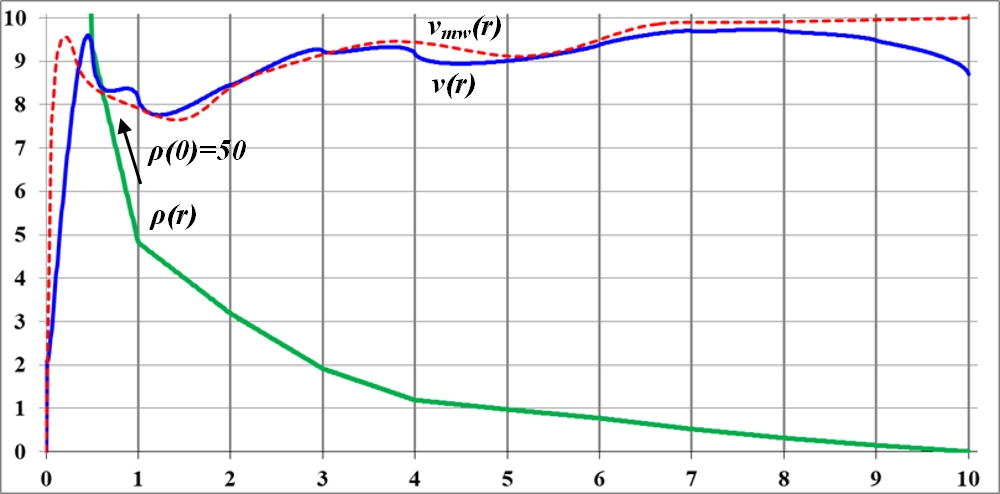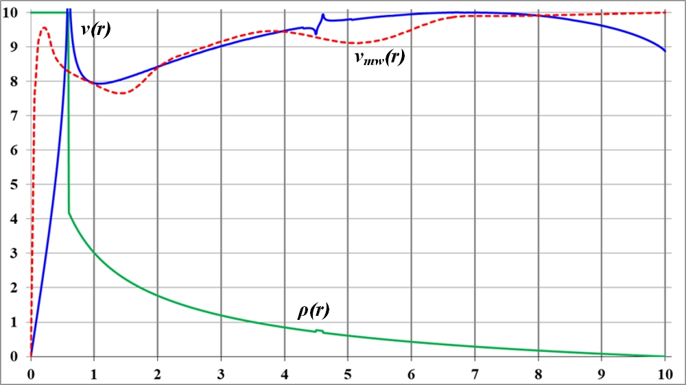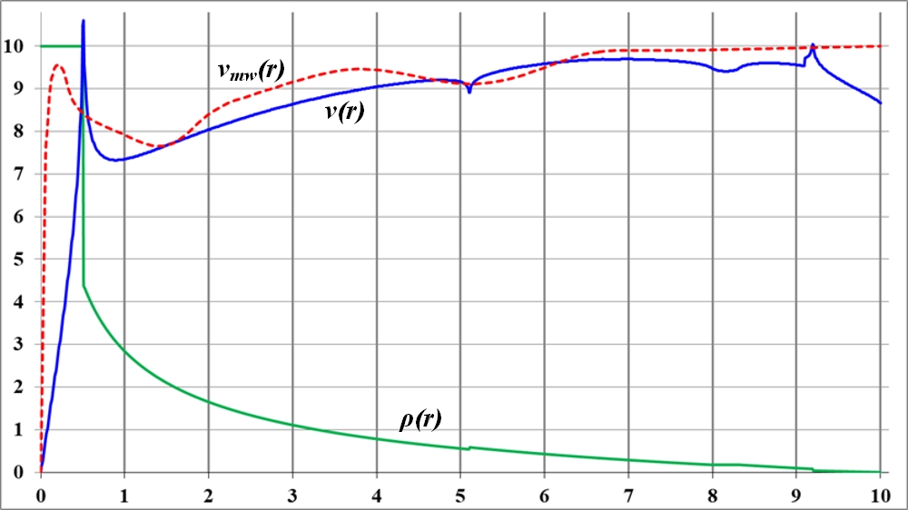 На графике видно, что в точке излома функции плотности на кривой вращения также образуется заметный излом. Но плавность изменения функции плотности по-прежнему приводит к плавному изменению кривой вращения. При этом можно предположить, что на интервале неизменности функции плотности кривая вращения растёт. Общая тенденция к уменьшению значения плотности ведёт к такому же уменьшению и величины скорости на кривой вращения.