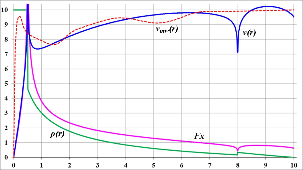 Неизменное значение плотности было до r = 0,59 включительно. Внешнее, приблизительное сходство графика с кривой вращения Млечного Пути, несомненно. А если изменить плотность на другом интервале радиусов? Попытки точечного изменения плотности показали, что прямой, пропорциональной связи между графиком плотности и кривой вращения нет. Каждый изгиб графика плотности, изгиб в любой его точке приводит к изменению кривой вращения также и в других её точках.
