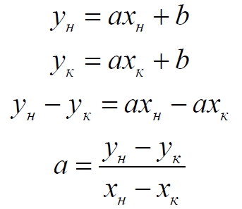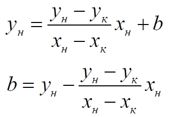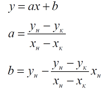 Каждый участок задаём координатами начала и конца (xнyн – xкyк). Уравнение линии определяем по этим точкам. Сначала находим коэффициент наклона прямой