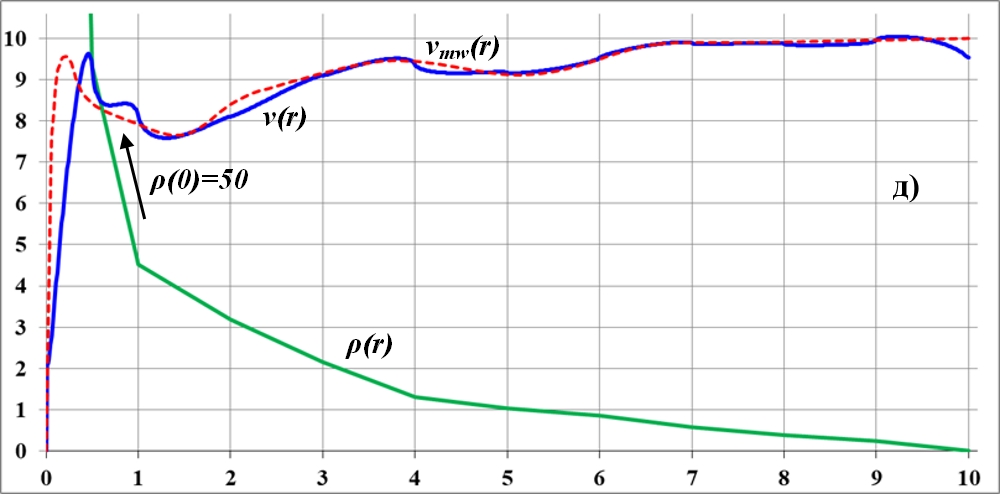 На рис.3.5а)…д) приведены кривые вращения диска и соответствующие им функции плотности, полученные в результате их последовательной деформации. Кривые вращения заметно приблизились к кривой вращения галактики Млечный Путь. Пробуем ещё точнее сблизить графики. Заключительный этап такого подбора приведён на следующем рисунке. Как видим, кривая вращения диска выглядит довольно близкой к наблюдаемой кривой вращения галактики Млечный Путь