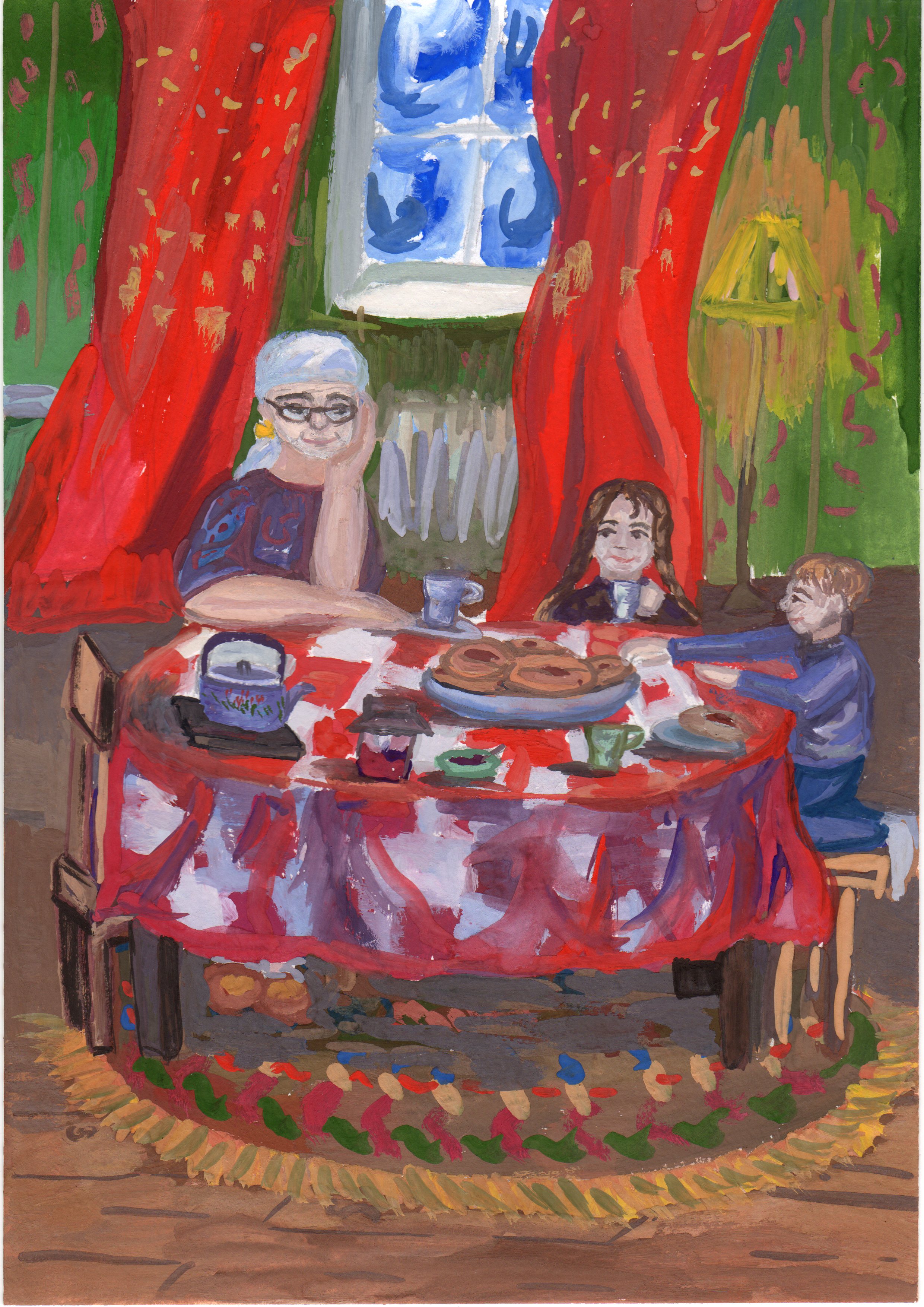 А сегодня бабушка испекла «шарлотку» – это пирог такой, яблочневый, ох и вкуснющий, я его даже больше ватрушек люблю. Испекла и убрала на комод доспевать. Остывать, значит. Вот он и доспел, раз зовёт пить чай. Когда чай попьём, мы снова на подоконник залезем и будем смотреть на снег, пока мама с папой не придут с работы.
