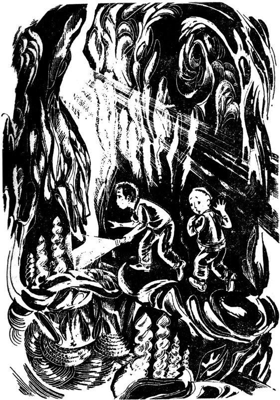 Tuynuk kengaya borib, oxiri kishi tik yursa bo‘ladigan g‘orga aylandi. Ozgina yurishgach, g‘orning bir chetidan tarnov bo‘lib tushayotgan suvni ko‘rishib, chanqovbosti qilishga oshiqishdi, lekin suv negadir qaynoq edi. Ularning hafsalasi pir bo‘ldi. Alamazon cho‘ntagini kavlashtirib uch dona qattiq non qalamchasini topdi, ikkitasini Eshmatga berdi.