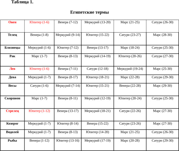По методике Критодерма (II век до н.э. – древнегреческий эллинистический ученый, астроном и астролог) каждый знак Зодиака был разделен на шесть равных частей по 5 градусов. Правителем первого терма Овна является Солнце, затем Венера, Меркурий, Сатурн, Юпитер и Марс – планеты септенера, за исключением Луны. Планеты имеют свои границы влияния в каждом знаке.