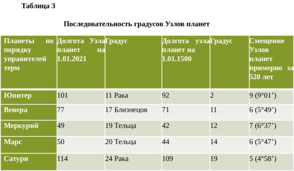 Последовательность градусов Узлов планет отражена в Таблице 3.