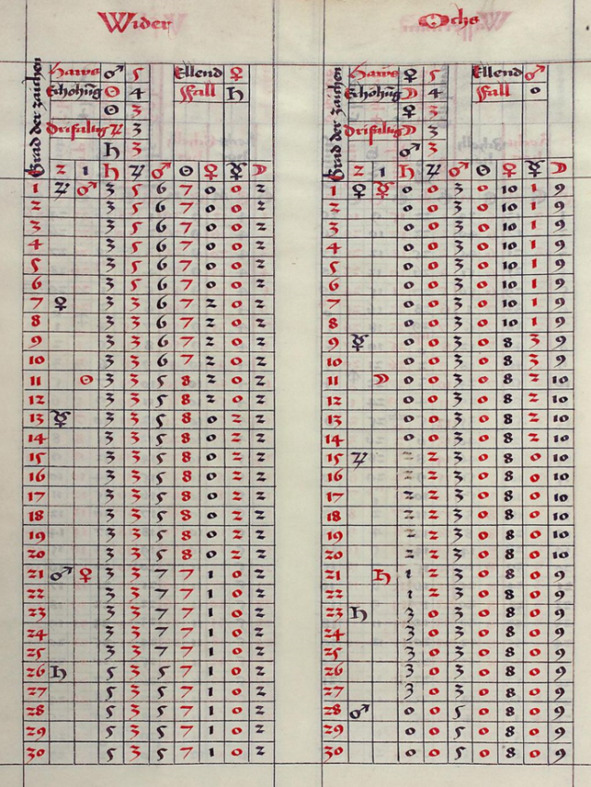 В Авестийской школе астрологии широко представлены методики оценки силы планет по различным статусам: кармическому, гороскопическому, афетическому. Каждый метод уникален. Например, афетика – метод работы с гороскопом личности, основанный на вычислении силы планеты в гороскопе рождения. Система предусматривает оценку планет по силе (динамическому импульсу), доброте (созидательной силе) и злобе (разрушительной силе). Система разработана П. П. Глобой и применяется в АША более 30 лет. Кроме афетического, используются и другие статусы: кармический, гороскопический и т. д. Оказывается, что и средневековые астрологи пользовались системой оценки планет по силе. В данной статье будет рассмотрен пример средневековой афетики2 (Рис. 1) конца XV в. предположительно из Астрологического календаря Региомонта́на. На рисунке мы видим два знака Зодиака – Овен и Телец. Они расписаны по градусам – 1-й столбец, деканам – 2-й столбец, термам – 3-й столбец. Далее расписана сила планет от Сатурна до Луны в каждом градусе Зодиака. Вверху указаны дополнительные баллы планеты в обители, экзальтации, дополнительный балл без уточнения функции. Здесь вероятнее всего добавление балла, если планета в знаке своей стихии, то есть в своем триплицитете3. В ночном варианте балл планете добавляется за хитрость и изменчивость. Принцип последнего балла пока не определен. Далее даны название планеты в изгнании и падении. Таблицы в современной адаптации приведены в Приложении 1 к Сборнику.