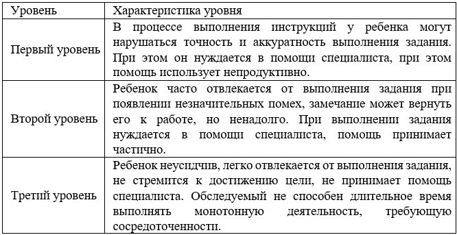 При определении уровня развития произвольной регуляции поведения и деятельности основное внимание уделяется определению сформированности трех видов произвольности: отраженной, сопряженной и подлинной. Отраженная произвольность – это способность ребенка выполнять инструкции совместно со взрослым. Сопряженная – способность ребенка выполнять инструкцию после проговаривания ее взрослым. Подлинная произвольность – способность ребенка самостоятельно затормаживать доминантную реакцию. Во время исследования данной функции важно держать фокус влияния на следующих параметрах: