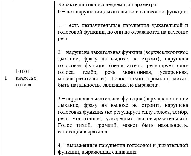 Заключительным разделом методических рекомендаций является определение функции и ее оценка в шкалах, тестах, таблицах. В данном разделе отражена «семиотика» выбранных параметров МКФ. Здесь представлено обозначение каждого из выбранных доменов в конкретном контексте психолого-педагогического обследования [5]. В качестве примера приведена оценка домена b3101 − качество голоса.