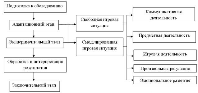 Третий блок – экспериментальный, проведение собственно психолого-педагогического обследования. Данный этап проходит в условиях смоделированной игровой ситуации, так как это эффективный инструмент, включающий в себя ряд структурированных и полуструктурированных задач для оценки необходимых параметров. Такая игровая ситуация включает в себя как активные, так и пассивные блоки, помогающие получить наиболее полную картину структуры коммуникативной, игровой, предметной деятельности и эмоционального поведения ребенка. Каждый активный блок включает в себя как минимум три пробы. В нашем психолого-педагогическом обследовании мы используем диагностические пробы, разработанные Е.О. Смирновой, Л.Н. Галигузовой, Т.В. Ермоловой, С.Ю. Мещеряковой, М.И. Лисиной, Г.В. Пантюхиной, К.Л. Печорой, Э.Л. Фрухт.