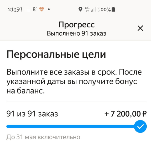 На скриншоте мне видно, что 91заказ выполнен за неделю в мае, и за это достижение мне выплатили 7200 рублей. Это как один день отработать. Но дальше интересней: если 91 заказ водитель смог выполнить, то в следующий раз персональная цель будет выше.