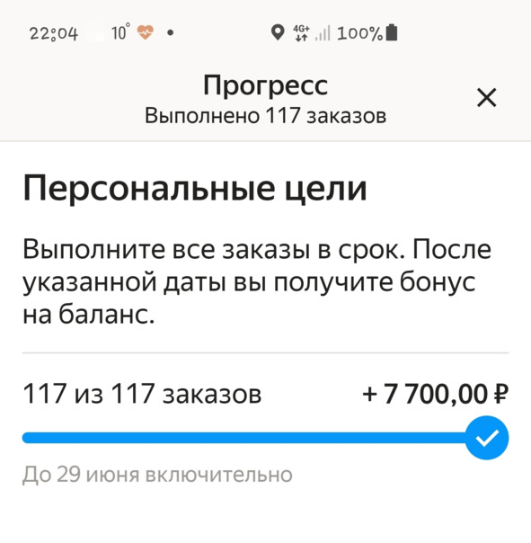 «Выполните все заказы в срок. После указанной даты вы получите бонус на баланс». Такое сообщение приходит от агрегатора такси. В этот раз мне дают цель в 117 заказов за 7 дней. Это получается, что, выполняя по 20 заказов в день, за 6 дней набирается 120 заказов, то есть цель достижимая и еще 1 день остается в запасе.