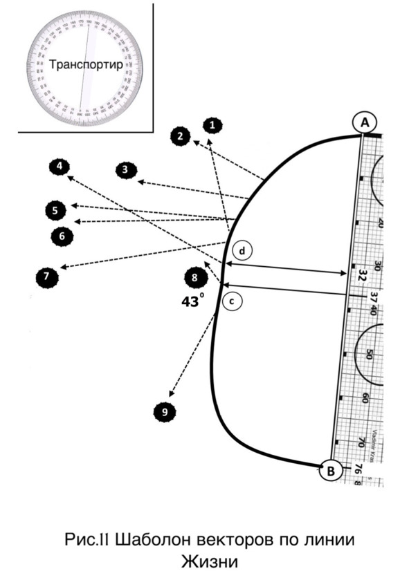 Изготовление шаблона. Убираем общий фон ладони и транспортиром измеряем градусы углов, образующихся при пересечении направляющей AB и векторов (отм.1—9 рисунок 11 страница 26). Точка с соответствует 43 градусам.