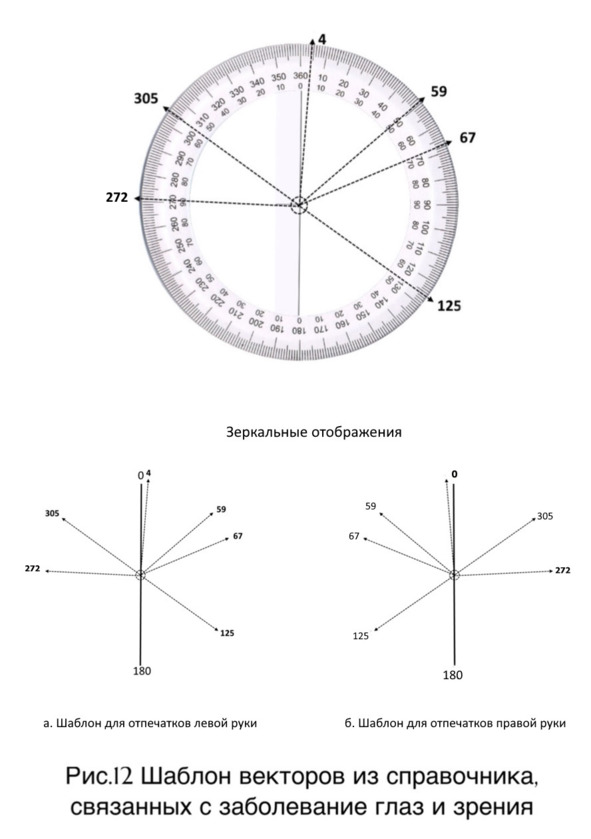 Шаблон векторов глазных заболеваний (рисунок 12 страница 27) изготавливается самостоятельно, соотносятся с шестью показателями, а именно: 4, 59, 67, 125, 272 и 305 градусами (полное писание градусов даны на страницах 35, 70, 75, 112, 212 и 236). При соотнесении данных по шаблонам выявляется совпадение на 67 градусе с точкой d (отм. 4 рисунок 13 страница 28).