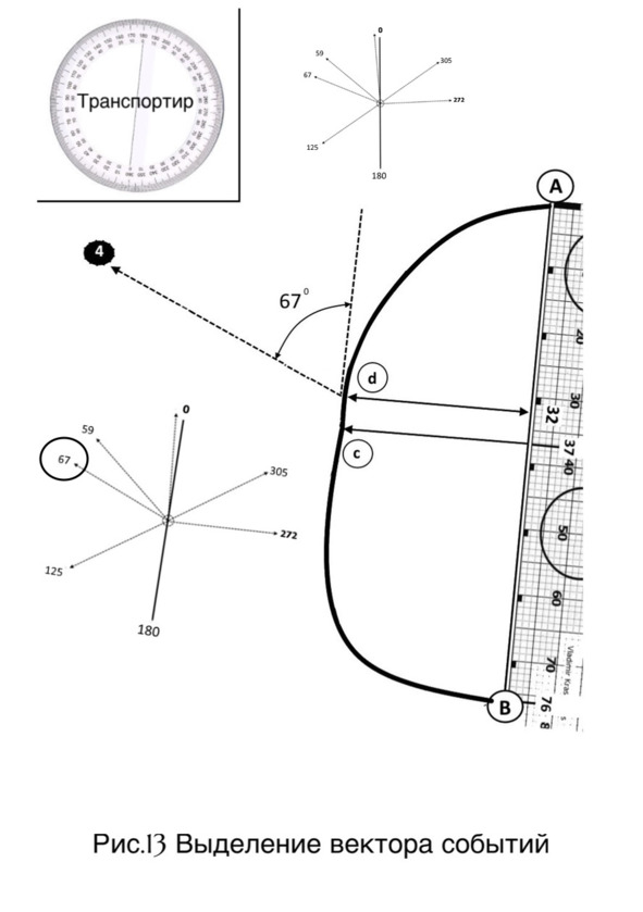 На линии жизни отмечаем событие, это точка с (женщина ослепла), соответствующая возрасту 37 лет (рисунок 9 страница 24). Далее, по линиям событий (дополнительным) проводим вектора. Точка «с» совпадает с началом одного из векторов (отм.8 рисунок 10 страница 25).