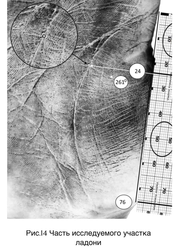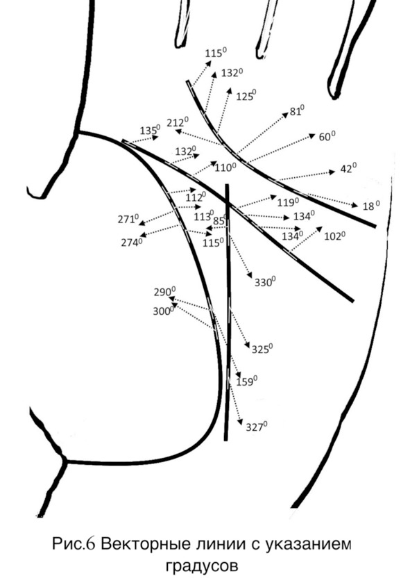 Пример. Вектор под углом 112 градусов в начале на линии жизни (рисунок 6 страница 19). Этот градус находится в области развития (описание на странице 103), и означает, что данному человеку присущи мечтательность, жертвенность, оторванность от реальности. Успех будет достигаться с трудом и придет ближе к середине жизни. Возможность проявить себя в медицине, политике, творчестве. Большая самоотдача в отношениях, сильная привязанность к близким, многодетность. Стоит обратить внимание на состояние органов, содержащих в себе жидкость-желчного пузыря, желудка, лимфатические узлы. С осторожностью относиться к огню и всему, что с ним связано, химическим веществам, пище, так как чревато отравлениями.