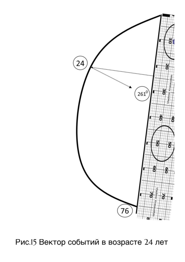 От точки, соответствующей возрасту самоубийства 24 годам проведена линия. Точка ее пересечения с линией жизни соотносится с началом добавочной линии и 261 градусом (рисунок 14 страница 30).