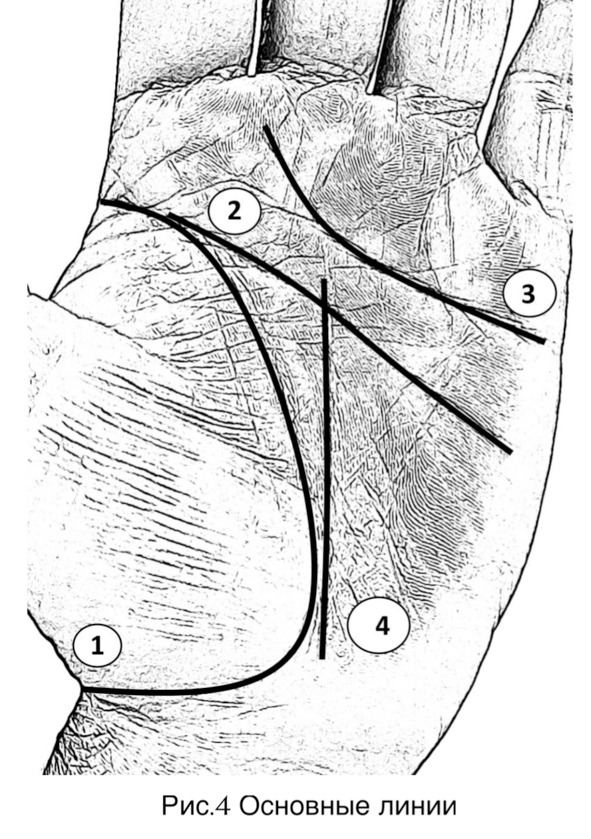 Линия 1 (жизни) обрамляет большой палец (Венеры). Присутствует у подавляющего большинства людей, отсутствие её – крайне редкое явление. Отражает основные события в течение жизни, здоровье. В своей практике ещё не встречал случая, когда её бы не было (рисунок 4 страница 16).