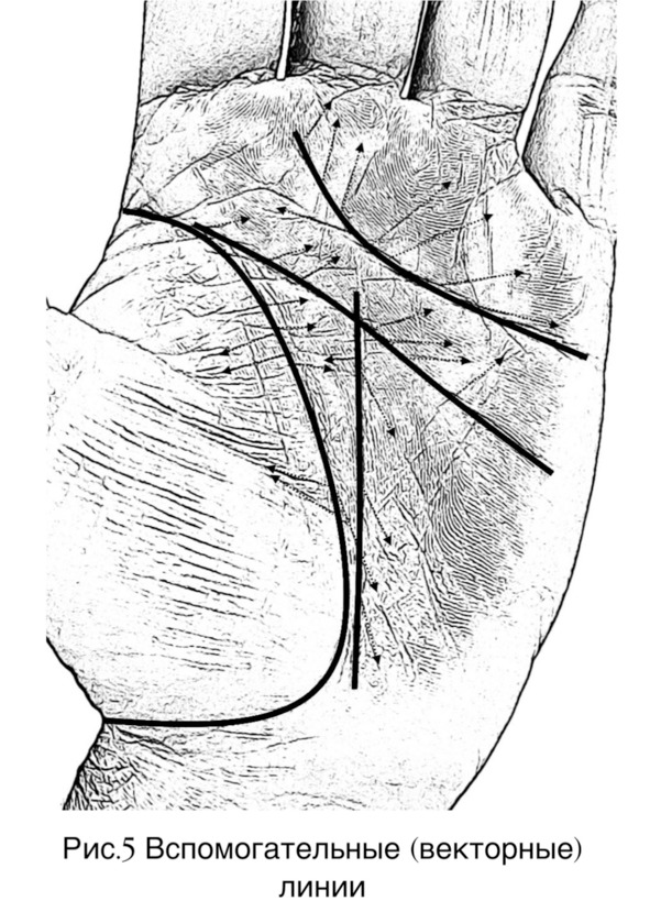 Мелкие, ярко выраженные линии, отходящие от основных (рисунок 5 страница 18). Несут основную информацию (черты личности, события, опасности, наклонности и т.д.). Они располагаются под определенными углами по отношению к основным линиям. Исходя из величин градусов этих углов и использования справочника представляется возможным трактовать эти линии.