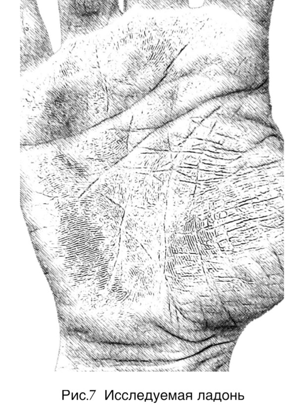 Пример: ЖЕНЩИНА. Родилась 17.01.1982 в Самарской области. В 32 года вышла замуж, в 33 родила. Беременность проходила трудно, в семье в это время были конфликты. В 37 лет ослепла на правый глаз. Частичная атрофия зрительного нерва. Незадолго до потери зрения ей приснился сон- смотрела правым глазом в дверной глазок, видела мутное изображение. Рисунок ладони женщины показан на странице 22.