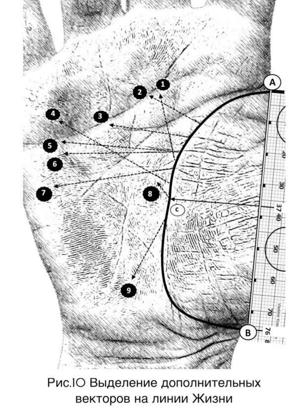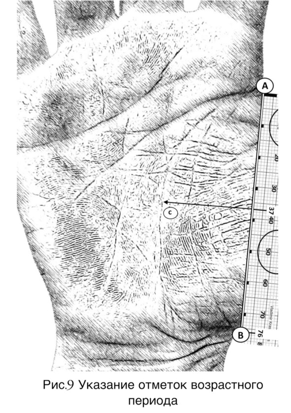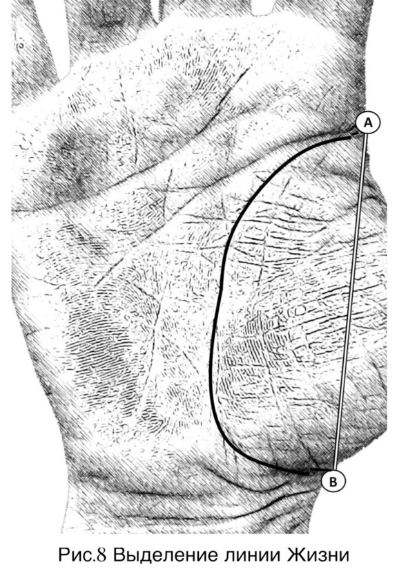 Любым из способов – ручкой, карандашом выделить линию жизни (рисунок 8 страница 23). Точка А– начало, точка В– её окончание. Отрезок АВ– направляющая (соединение точек).
