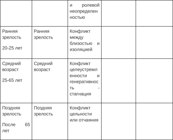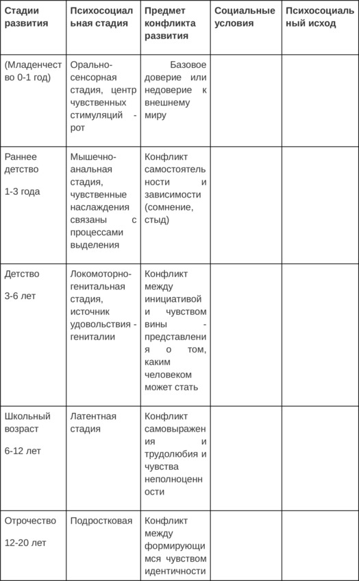 В 4ом столбце «Социальные условия» – опиши, какие возможности у тебя были для удовлетворения потребностей кризисного периода. Достаточные или нет. В «Психосоциальном исходе» укажи результат прохождения кризисного этапа – что в итоге получила, позитивный или аномальный исход развития. В строках про возраст, который еще не наступил, напиши, как ты планируешь пройти эти этапы.