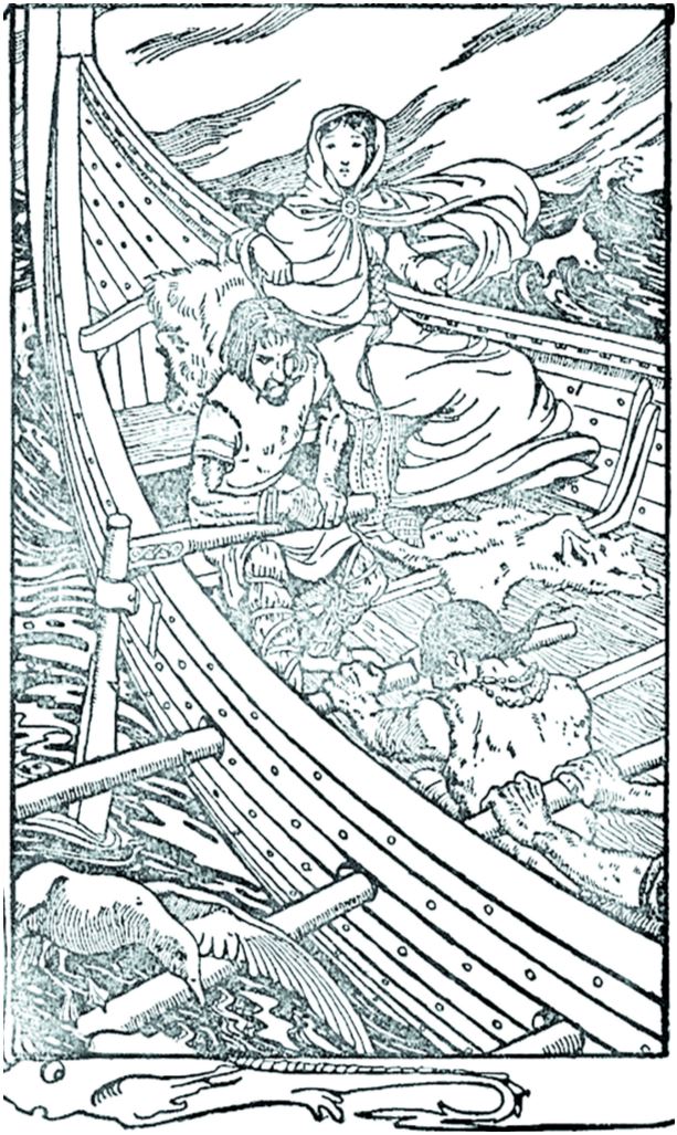 Bu sözlerin ardından kadın av borusunu kaldırmış ve boruya üfleyerek çok güçlü bir ses çıkarmış. Bunu yaptığı gibi, yine olağanüstü bir şekilde değişmeye başlamış. Üzerindeki o çirkin kül rengi elbise gitmiş, gri saçları yok olmuş ve yeniden yeşil etekli, pelerinli genç ve güzel haline dönmüş.