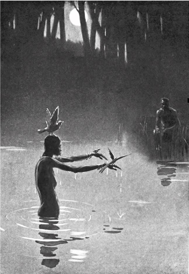 Üç gün üç gece altın kuşları izleyerek dağları aştılar. Dördüncü günün sabahında kuşlar onları dik bir dağ yamacından aşağı indirerek derin ve yeşil bir vadiye getirdi. Vadinin ortasında geniş bir ırmak akıyordu. Kuşlar büyük ağaçların gölgesi altındaki derin ve berrak gölete varana dek ırmak boyunca ilerlediler. Su, pek serin ve durgundu. Ayrıca göletin etrafı uzun kamışlar ve kocaman beyaz zambaklarla kaplıydı. Suyun üstünde de beyaz ve mor renkli nilüferler vardı.