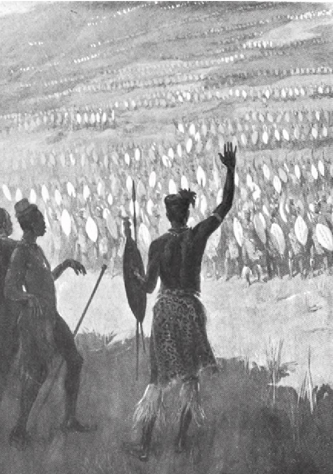 “Askerlerim ve halkım için istedim bu kulübeleri,” dedi Setuli. Sonra kuşlara döndü ve tek bir kelimeyle hepsini birer savaşçıya dönüştürdü. Sakobulalar, Setuli’nin birinci alayını teşkil etmekteydi. Bunlar leopar derisine sarınmış uzun boylu adamlardı, ellerinde ise assegai4 ve öküz derisinden yapılmış kocaman kalkanlar vardı. Ama eski hallerini tamamen yitirmemişlerdi. Her adamın başında, sakobulaların uzun kuyruk tüylerinden yapılmış bir şapka vardı. Sıraya girip şeflerini selamladılar. Ardından kulübelerine yöneldiler. İkinci olarak, altın renkli sarı asma kuşları geldi. Bunlar Setuli’nin koruması olup sakobulalardan bile daha hoş kuşlardı. Gümüş renkli çakal derisine bürünmüşler, dizleri ile kollarına beyaz öküz kuyruğundan halkalar sarmışlardı. Bunlar umfaan yani ordunun yükünü taşıyıp hizmet eden delikanlılar olmuştu. İlk dolu taneleri toprağa düştüğü esnada Setuli herkesi kulübelerine yolladı. Başlarında ise uzun ve siyah deve kuşu tüyleri vardı. Hemen önlerinde dolunay gibi parlayan altın sarı asma kuşu duruyordu. Setuli’nin yanındaki bu kuş, ordunun komutanıydı. Nihayet rooibekkieler de geldi.