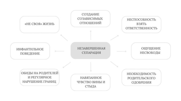 Можно жить отдельно, быть успешным, но если нет психологической сепарации, то человек не находит удовлетворения. Бессознательно он ещё что-то доказывает своим родителям, запрещает сам себе. «Я хочу, но внутренний запрет срабатывает». И часто непройденная сепарация проецируется на супруга.