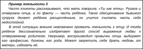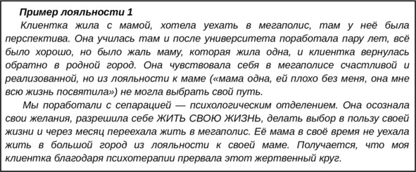 Лояльность – это неосознаваемая человеком верность порядкам и устоям, поступкам и проступкам, правилам и запретам, существующим в семейной системе. В основе лояльности, с одной стороны, лежит любовь к членам своей семьи, с другой – страх потерять принадлежность к своей семье, то есть быть ею отвергнутым. Из лояльности каждый человек считает убеждения, правила и порядки своей семьи верными и правильными.