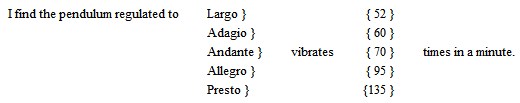 Turning to your Encyclopedie, Arts et Metiers, tome 3, part 1, page 393, you will find mentioned an instrument, invented by a Monsieur Renaudin, for determining the true time of the musical movements, largo, adagio, &c. I went to see it. He showed me his first invention; the price of the machine was twenty-five guineas; then his second, which he had been able to make for about half that sum. Both of these had a mainspring and a balance wheel, for their mover and regulator. The strokes were made by a small hammer. He then showed me his last, which is moved by a weight and regulated by a pendulum, and which cost only two guineas and a half. It presents, in front, a dial-plate like that of a clock, on which are arranged, in a circle, the words largo, adagio, andante, allegro, presto. The circle is moreover divided into fifty-two equal degrees. Largo is at 1, adagio at 11, andante at 22, allegro at 36, and presto at 46. Turning the index to any one of these, the pendulum (which is a string, with a ball hanging to it) shortens or lengthens, so that one of its vibrations gives you a crotchet for that movement. This instrument has been examined by the academy of music here, who are so well satisfied of its utility, that they have ordered all music which shall be printed here, in future, to have the movements numbered in correspondence with this plexi-chronometer. I need not tell you that the numbers between two movements, as between 22 and 36, give the quicker or slower degrees of the movements, such as the quick andante, or moderate allegro. The instrument is useful, but still it may be greatly simplified. I got him to make me one, and having fixed a pendulum vibrating seconds, I tried by that the vibrations of his pendulum, according to the several movements.