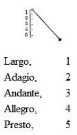 In the wall of your chamber, over the instrument, drive five little brads, as 1, 2, 3, 4, 5, in the following manner. Take a string with a bob to it, of such length, as that hung on No. 1, it shall vibrate fifty-two times in a minute. Then proceed by trial to drive No. 2, at such a distance, that drawing the loop of the string to that, the part remaining between 1 and the bob, shall vibrate sixty times in a minute. Fix the third for seventy vibrations, &c.; the cord always hanging over No. 1, as the centre of vibration. A person, playing on the violin, may fix this on his music stand. A pendulum thrown into vibration, will continue in motion long enough to give you the time of your piece. I have been thus particular, on the supposition that you would fix one of these simple things for yourself.