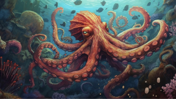 Из ближайшей постройки выплыл осьминог и, включив свой реактивный двигатель, помчался прямо на аппарат. Сергей приглушил освещение. Осьминог остановился у переднего иллюминатора и заглянул, как прежде, внутрь корабля. Его огромные осмысленные глаза смотрели на людей. И я, и Сергей почувствовали какое-то давление на мозг, и в наших головах вдруг сформировался призыв осьминога к дружбе, на который мы оба одновременно кивнули в знак принятия этого предложения. Осьминог отплыл немного от стекла и медленно, словно приглашая за собой корабль, поплыл вдаль. Сергей повел «Дельфина» за ним.