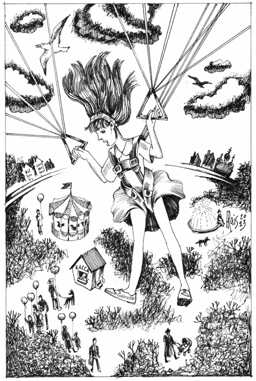 Я кивнула и потащилась к винтовой лестнице, ведущей наверх. Тут к нам подошел служитель и что-то папе сказал. Маленьким детям прыгать с вышки было категорически запрещено. Но тогда законы выполнялись как-то вяло – Сталин-то помер несколько лет назад. Поэтому за умеренное вознаграждение служащий отошел в сторонку, а мы начали взбираться по винтовой лестнице наверх. Голова у меня кружилась, я вся тряслась от страха, но старалась не подавать виду. Спортивный папа взбирался за мной, в какой-то степени меня подстраховывая. Наверху работник вышки, которого я уже от страха не видела, стал закреплять на мне ремни парашюта. Конструкция была явно не рассчитана на ребенка. Достали еще ремни и кое-как закрепили на груди, спине и в подмышках. Я стояла на краю этой прозрачной металлической конструкции в какой-то немыслимой высоте. Вдалеке виднелся парк, фигурки людей, скамейки, фонтаны.