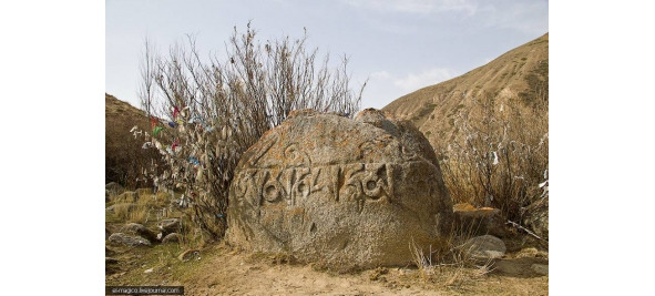 Совершенно уникальный случай – камень с высеченной надписью полуметрового размера – рис. 34. Камни Тамга-таш расположены на правом берегу реки Тамги в семи километрах выше ее впадения в озеро Иссык-Куль (Киргизия). Своими очертаниями она напоминает юрту. Глыба опоясана надписью полуметровой длины. Надпись на тибетском языке: «Ом мани падме хум» – повторяется трижды. Это мантра, или божественная формула буддизма (Киргизия).