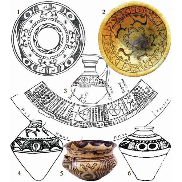 Рис. 21. Изображение календаря: 1, 2, 4, 6 – календари на керамике Триполья; 5 – календарное изображение на керамике Кукутени; 3 – календарь на кувшине черняховской культуры (3 – 4 век) [13]