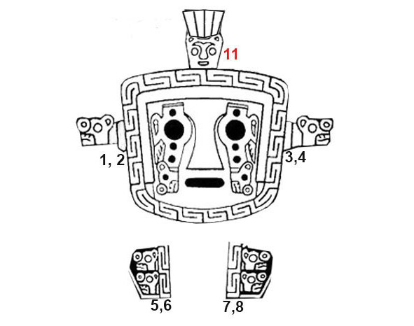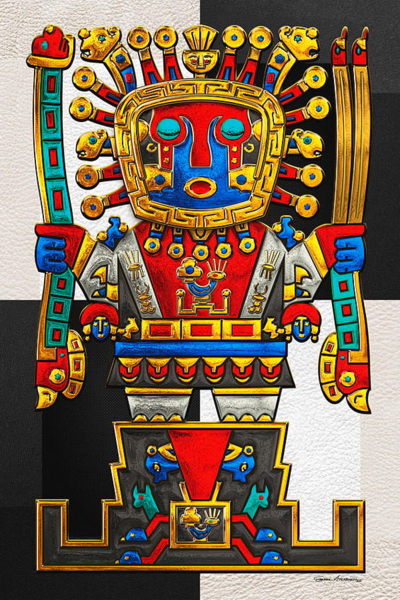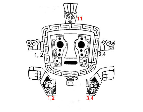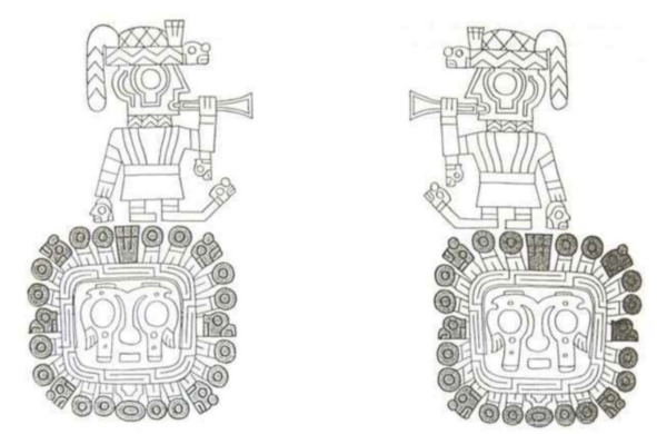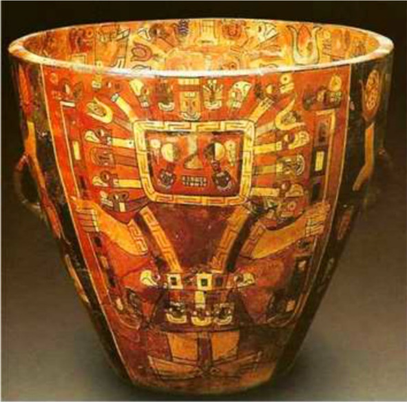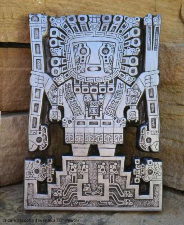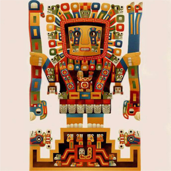 Рис. 39. Сосуд культуры Уари (I век н.э). Золотая фигура Бога Виракочи времен инков. Число звеньев цепочки меандра – 14. Меркурий имеет 4 полоски сверху [257]