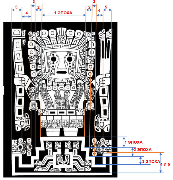 На рис. 51 показаны эпохи календаря Тиуанако, связанные со ступенями пирамиды, на которой стоит Верховный Бог. Длительность каждой эпохи около пяти тысяч лет. Более точно, эпохи можно указать по календарю майя. Такое заимствование допускают все исследователи Тиуанако, например, один из главных исследователей, Артур Познанский писал о том, что Тиуанако объединяет влияние мезоамериканских и южноамериканских народностей. А майя, как раз, принадлежат к мезоамериканским народностям.