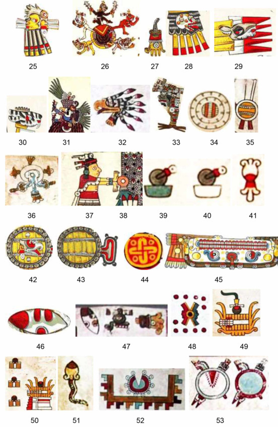 25 – Юпитер (пять полос внизу), влияние на Венеру два раза – (по две полоски слева и справа), эпоха – №3 (три черточки на полосках); 26 – Юпитер теряет часть своей массы и из него вылетает Венера (пять изображений), у каждой по две фигурки на голове, возможно, здесь и спутники; 27 – Земля (три пальца) и по бокам – загнутые пальца с кольцом – спутники; 28 – Юпитер (пять полосок); 29 – Юпитер (пять полосок) и антропоморфное изображение; 30 – Сатурн – антропоморфное изображение с 6-ю выступами на голове; 31 – Сатурн (шест перьев на голове); 32 – планета в огне – Сатурн; 33 – Сатурн (нога с 6-ю пальцами) и три влияния на Землю (сверху три полоски с указанием эпох); 34 – эмблема погибшей планеты с указанием времени; 35 – влияющая планета типа Тифона, Нибиру и др.; 36 – планета типа Тифона, под влиянием которой изменила состояние Земля; 37 – Венера (две полоски на голове); 38 – Венера отталкивает планету, типа Тифона, которая пытается её захватить; 39 – влияние вешней планеты типа Тифона, когда гидросфера не изменилась; 40 – влияние внешней планеты типа Тифона, когда гидросфера сильно уменьшилась; 41 – влияние нейтронной звезды в результате которого изменилась атмосфера; 42 – блуждающая планета типа Фаэтона; 43 – блуждающая планета с четырьмя спутниками; 44 – Нейтронная звезда, движущаяся и вращающаяся; 45 – влияние планеты типа Тифона на Марс (четыре полоски) и на Юпитер (пять полосок); 46 – блуждающая планета типа Тифона, красными зонами указаны эпохи воздействия; 47 – три типа изображения блуждающей планеты; 48 – планета типа Нибиру или Тифона разорванная внешними силами; 49 – десант на НЛО и с зарядами, возможно ядерными; 50 – несколько ЛА (десант сверху) с оружием и зарядами, возможно, ядерными; 51 – нейтронная звезда с хвостом; 52 – Юпитер, из которого произошел выброс Венеры по влиянием Сатурна (по бокам – 6 выступов); 53 – вращающаяся блуждающая планета.
