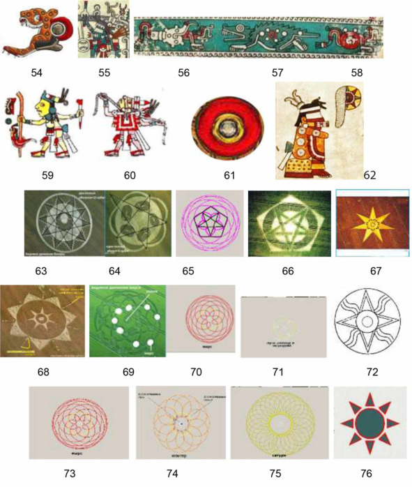 54 – нейтронная звезда; 55 – вихри у Венеры в период разрушения атмосферы; 56, 57 и 58 – изображения звезды, под влиянием которой изменились параметры планет; 59 – Земля (три перышка на голове) сражается с планетой, оказавшей влияние; 60 – потеря атмосферы Земли при катастрофе, частичное удушение; 61 – планета типа Тифона, оказавшая влияние на планеты Солнечной системы; 62 – затмение Солнца, у Земли (три полоски на голове) и у Венеры (два выступа на голове) завязаны глаза, что символизирует потерю видимости; 63 – два оборота Венеры – 10 углов; 64 – Венера, пять лепестков; 65 – Венера, взаимное движение Земли и Венеры – пятиугольная фигура; 66 – Венера; 67 – Марс (семь углов при взаимном движении Земли и Марса); 68 – Марс, круги на полях; 69 – Земля и Марс; 70 – Марс: 71 – Меркурий; 72 – Солнце; 73 – Марс; 74 – Юпитер; 75 – Сатурн; 76 – звезда.