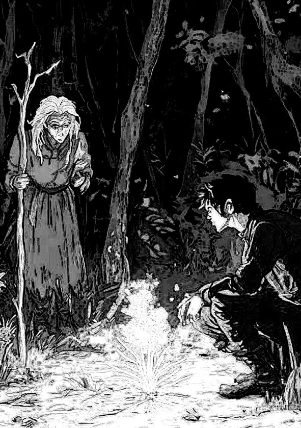 Алхим стоял, раздумывая, когда вдруг заметил движение на краю поляны. Между деревьями показался силуэт. Сначала он подумал, что это его пропавшая корова, но, присмотревшись, понял, что это была не Альва. Это была высокая фигура, окутанная плащом, которая приближалась к нему. С каждой секундой становилось всё яснее: перед ним была не просто случайная путница.
