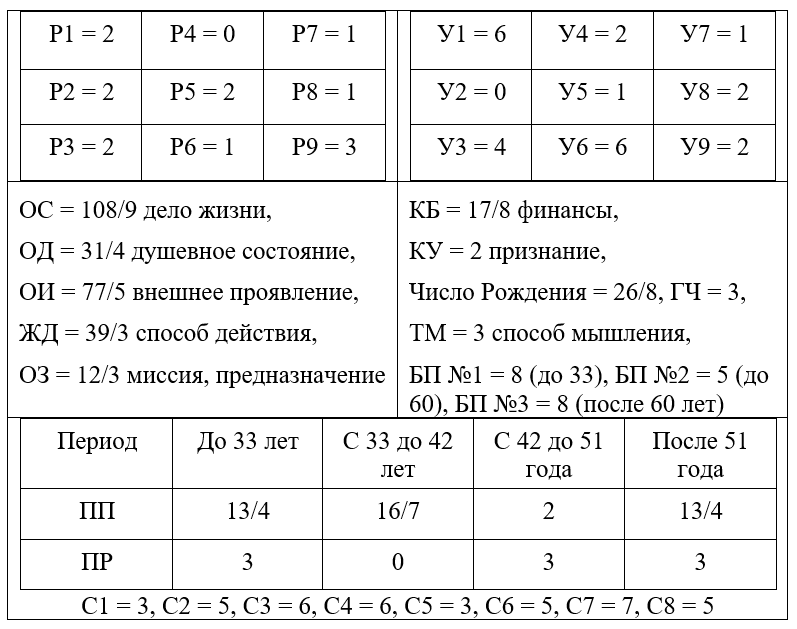 Периоды ПП и ПР (неосознанные ценности) обозначены внизу таблицы, а над периодами указан возраст проявления. То есть первый период до 33 лет, ПП = 13/4, а ПР = 3. И так далее. Над последним периодом не указан возраст, поскольку он начинается с конца предыдущего периода. В примере выше с 51 года и далее.